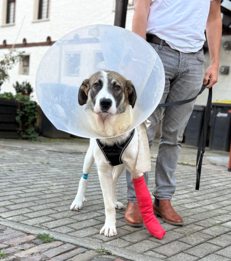 Schon früh fiel eine deutliche Fehlstellung seines linken Vorderlaufs auf. Die genaue Ursache lässt sich nicht mehr rekonstruieren – möglich ist eine Verletzung der Wachstumsfuge durch einen Unfall oder Misshandlung im Welpenalter. Mit dem Wachstum verschlechterte sich die Situation deutlich. Nach seiner Ausreise nach Deutschland wurde Felix umfassend untersucht und operiert: Elle und Speiche waren miteinander verwachsen und in zwei Richtungen verdreht. In einer aufwendigen Operation wurde der Knochen korrigiert und mit einem Fixateur stabilisiert.